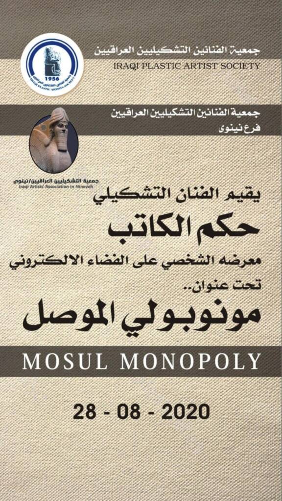 اقام الفنان التشكيلي حكم ناطق الكاتب المنتسب لديوان رئاسة جامعة الموصل قسم الاعلام والعلاقات العامة معرضه الشخصي عبر الفضاء الالكتروني تحت عنوان (مونوبولي الموصل) يوم الجمعة الموافق 28 آب 2020 ،على الفضاء الالكتروني في جمعية التشكيليين العراقيين فرع نينوى .